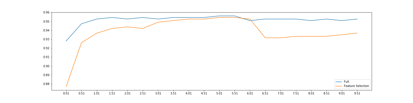 观察上图可以发现,我们在使用嵌入法降维后,模型在某些 C 值依然有比较好的表现效果。SelectFromModel(model, threshold=coef_/feature_importance) 还可以使用 coef/feature_impotance(线性回归有 coef,决策树有 feature_impotance) 进行过滤,当值小于阈值 threshold 时特征将被舍去。