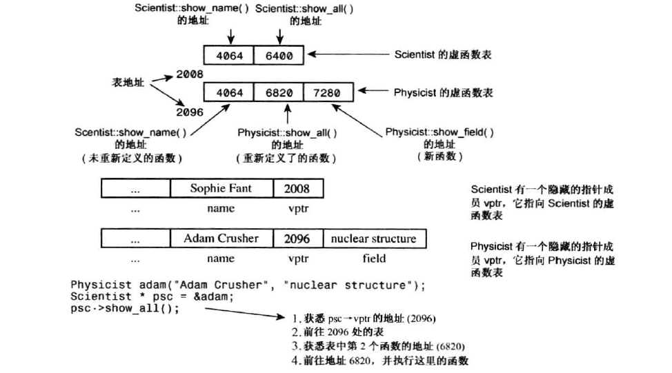 例如:基类对象包含一个指针,指向基类的虚函数表;派生类对象也有自己独立的指针指向派生类对象的虚函数表。如果派生类没有重新定义虚函数,该虚函数表保存函数原始版本的地址,否则保存新函数地址。如果派生类定义了新的函数(基类没有定义),则该函数的地址也将被添加到派生类的虚函数表中。