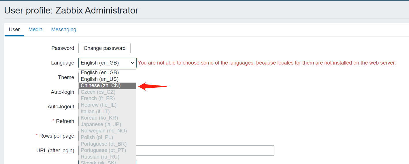登录zabbix后我们发现在用户设置界面无法将语言设置成中文