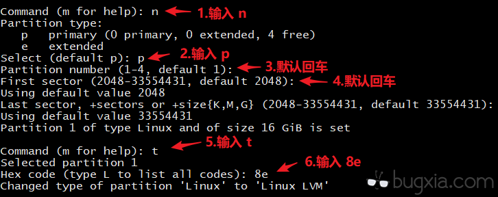 因为此虚拟机只有一块虚拟硬盘,即 /dev/sda,所以首先需要对此块硬盘的未分配空间进行分区操作,命令: