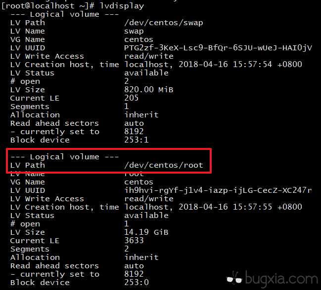 执行 lvdisplay 指令,显示逻辑卷属性,并记录根分区路径