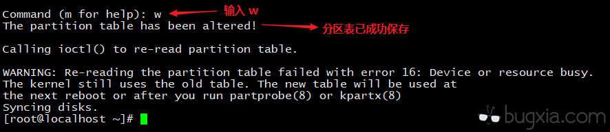 分区完毕,输入 w 保存分区表