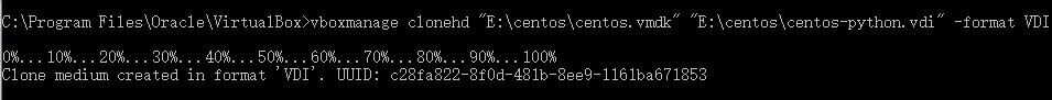 C:\Program Files\Oracle\VirtualBox>vboxmanage clonehd "E:\centos\centos.vmdk" "E:\centos\centos-python.vdi" -format VDI
