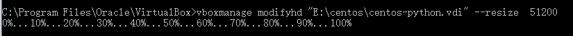 C:\Program Files\Oracle\VirtualBox>vboxmanage modifyhd "E:\centos\centos-python.vdi" --resize 51200