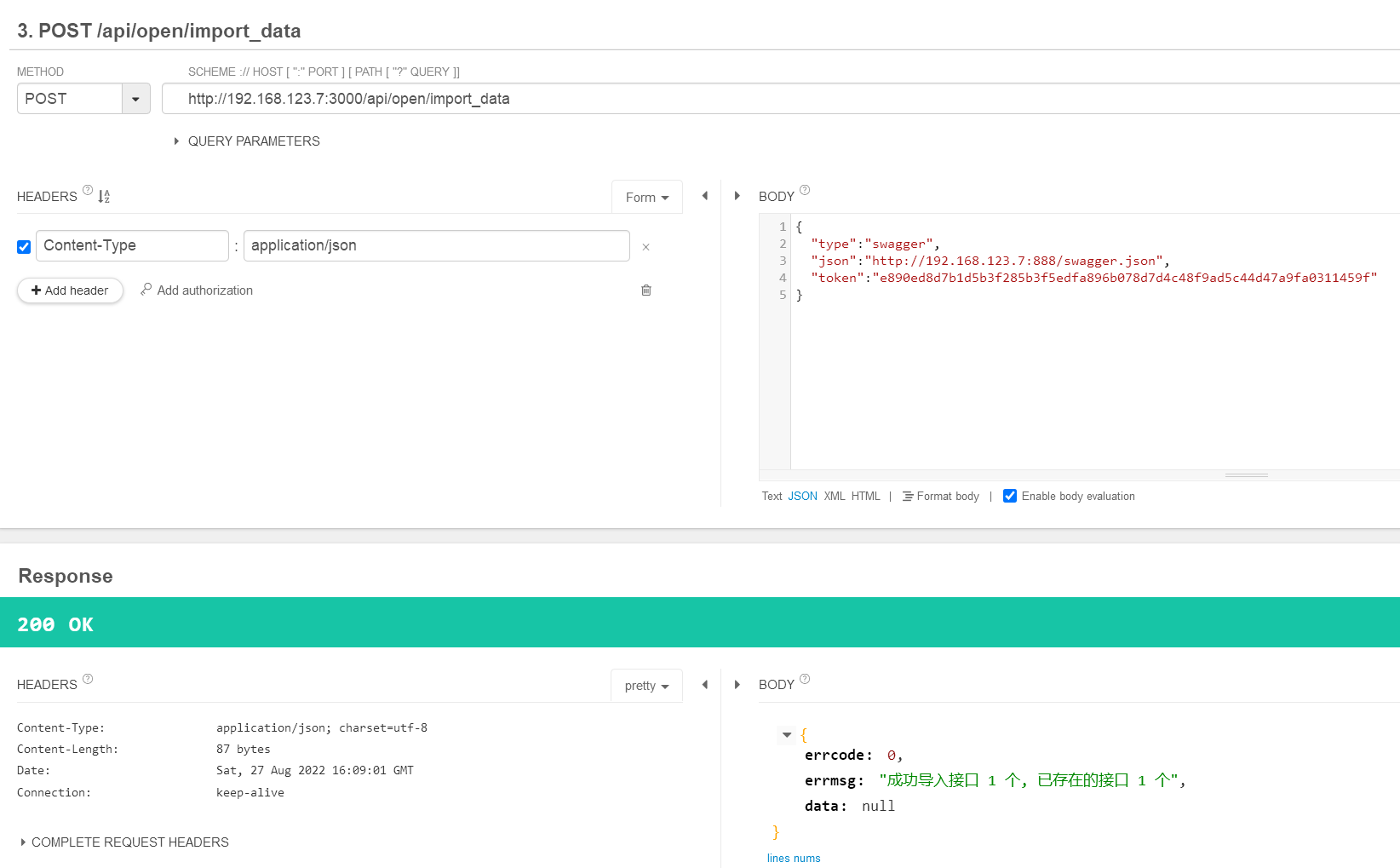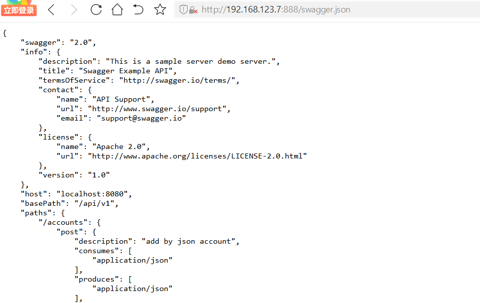 将swagger.json文件放到nginx的目录下,即使用nginx的静态文件服务功能。192.168.123.7:888/swagger.json