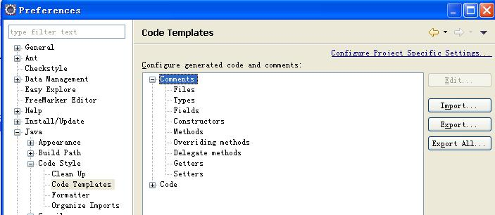 codetemplates.xml内容是我们自己预先定义好的,在这里先不详细描述,我们可以看到Eclipse Code Templates界面中间Configure generated code and comments区域包含了两个菜单树:Comment、Code,如下图所示: