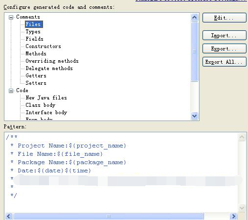 如上图所示,当我们点击Comments下的Files子菜单时,下面的Pattern会显示Java文件的头部注释。