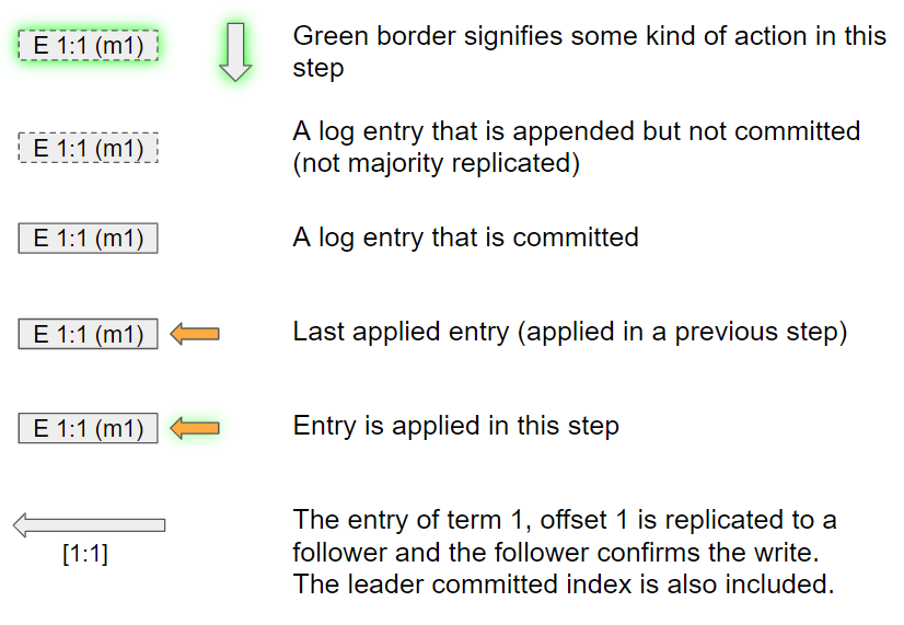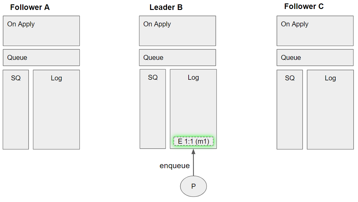 每个图由三个副本组成,一个领导者和两个追随者。我们可以看到日志的状态、service queue、队列表示和应用操作。每一个操作的格式为command term:offset data。例如E 1:1 m1是入队command,添加到第一个term中,具有偏移量1,消息为m1。Terms和offsets是Raft算法术语,对于理解local delivery来说并不特别重要(但如果你觉得有趣,我建议你阅读Raft算法论文)。