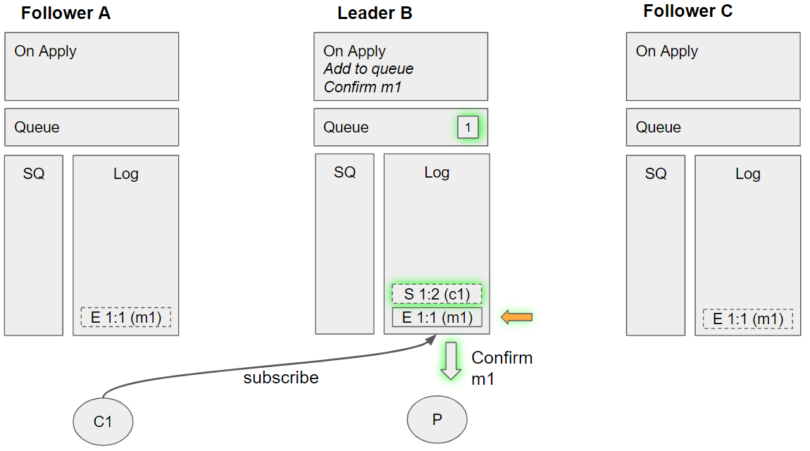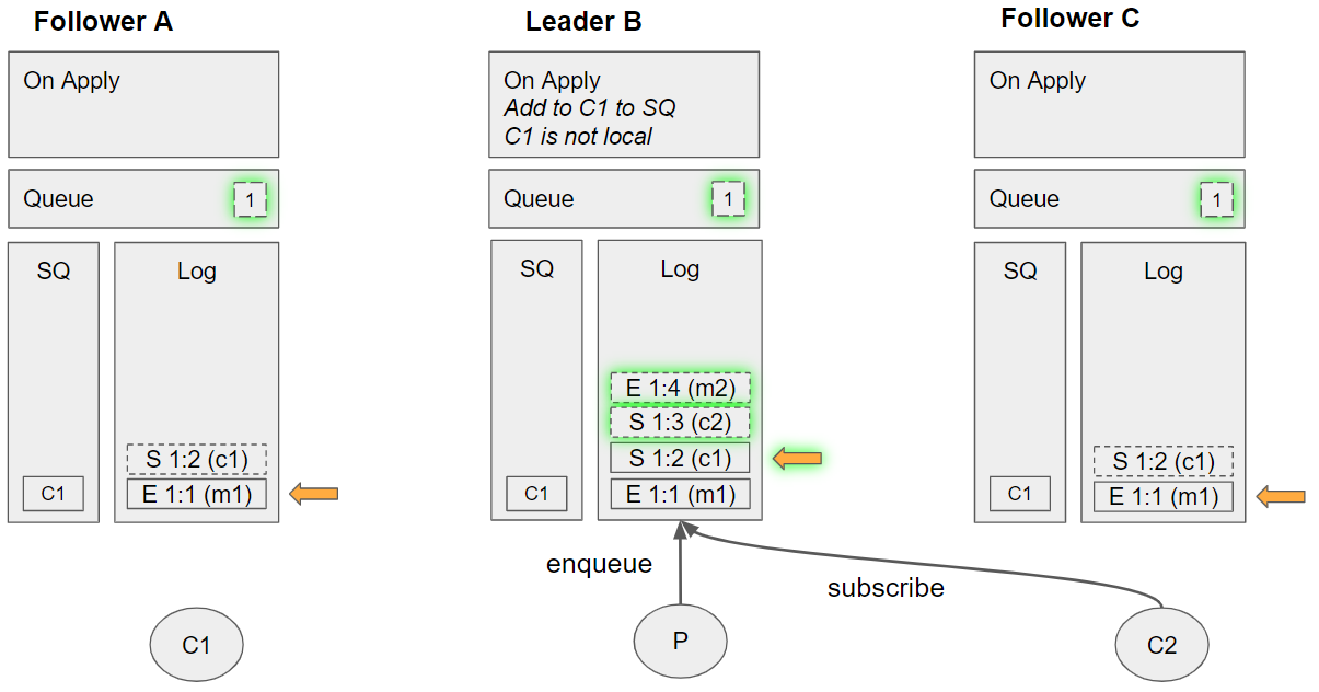 消费者当然存在,但副本只有在其日志中应用subscribe命令时才能感知到消费者。他们的日志中确实有这些命令,但尚未应用它们(4-1、4-2已经将订阅命令发送到了跟随者,但尚未应用)。