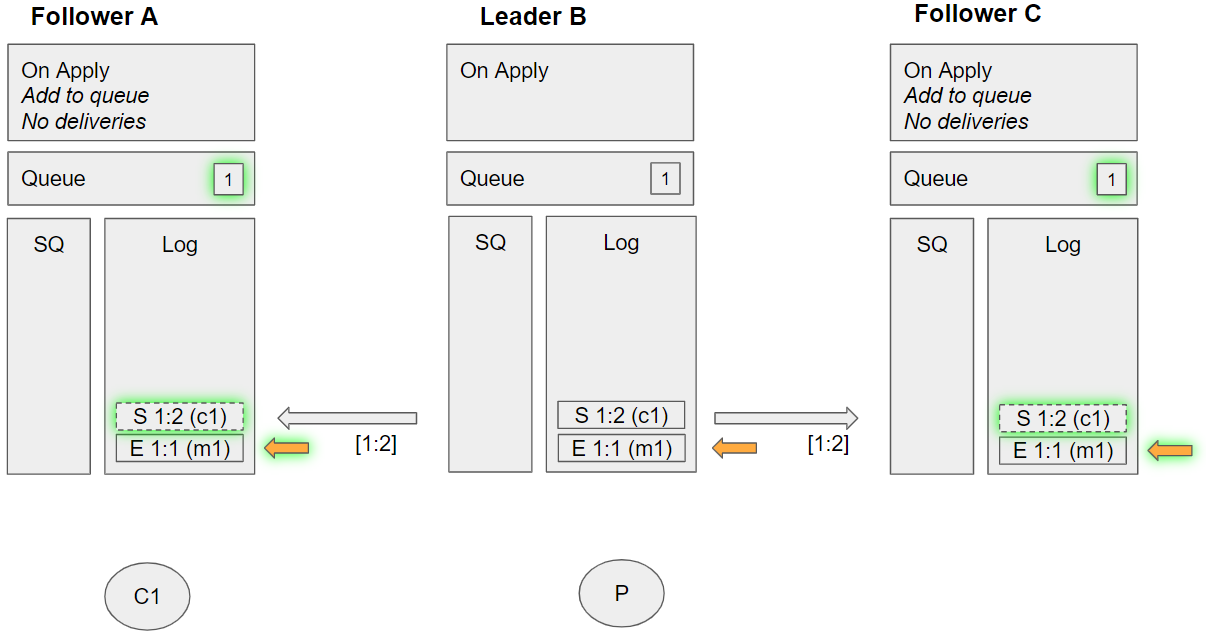每个副本按顺序应用日志中的每个已提交(多数已复制)command。应用enqueue命令将消息添加到队列中,应用consumer down命令将该consumer从Service Queue中删除(下面将详细介绍),并将其挂起的所有消息返回队列以重新投递。