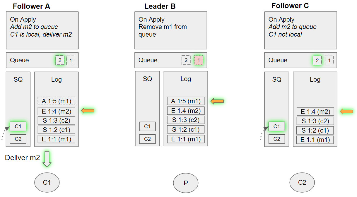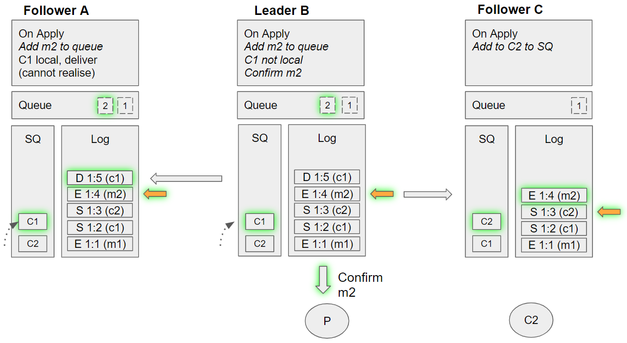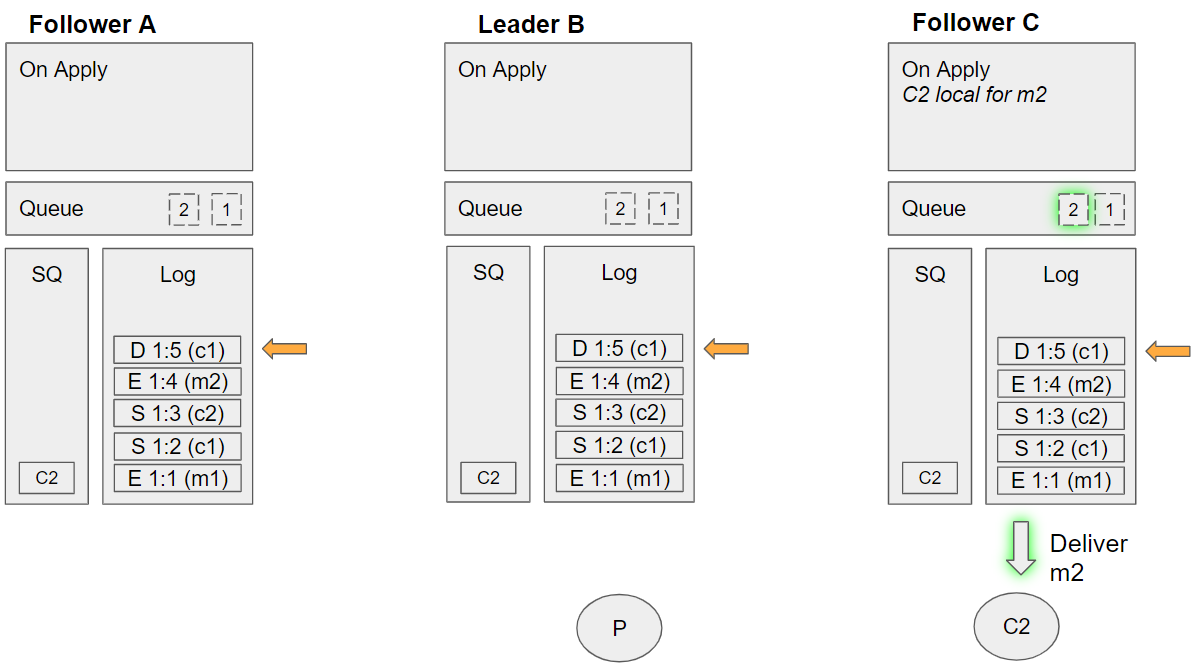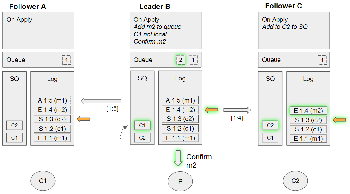 - Leader B处理下一条未送达的消息m2,将C2从SQ中出队,但C2不是本地,C2重新入队SQ,并跟踪m2状态