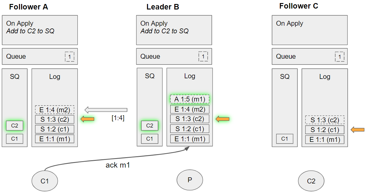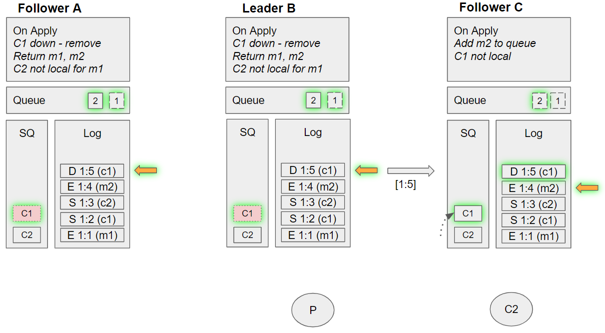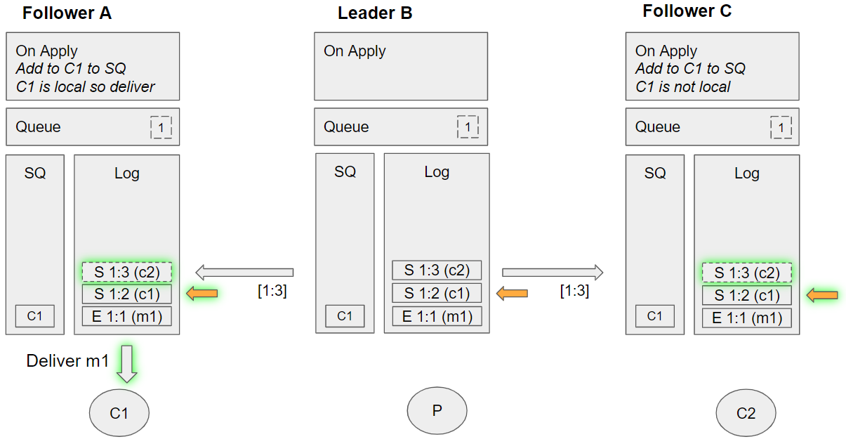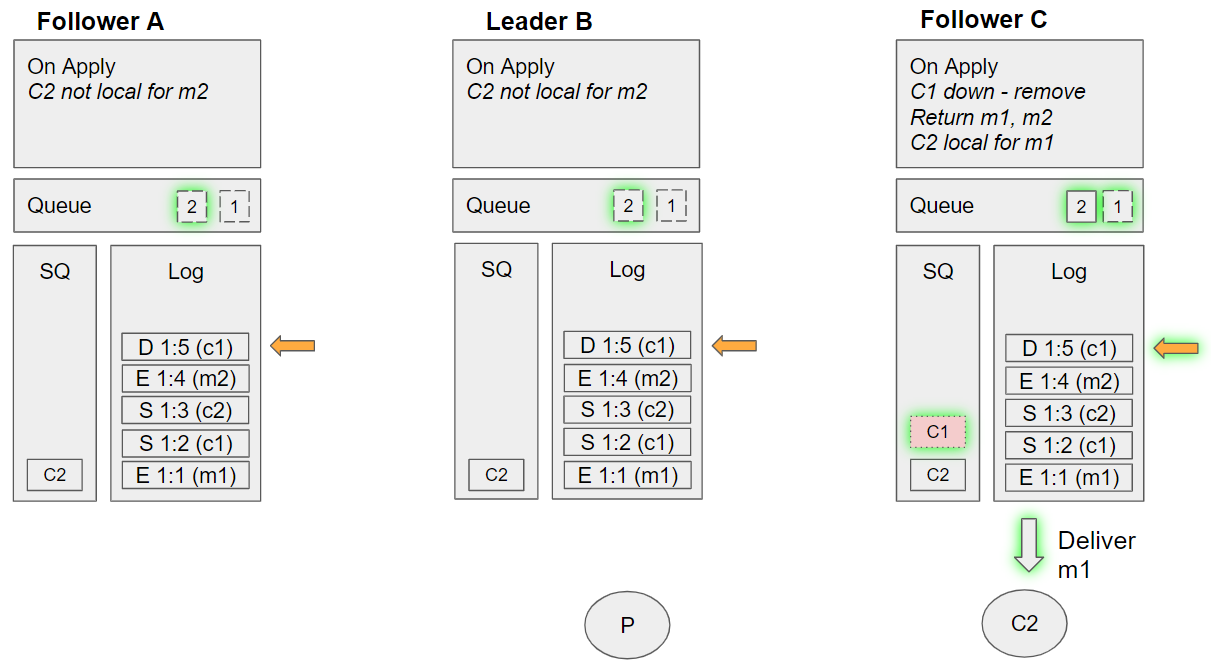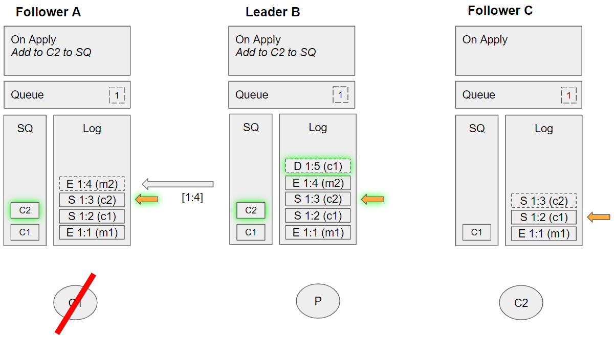- Leader B处理下一条未送达的消息m2,将C2从SQ中出队,但C2不是本地,C2重新入队SQ,并跟踪m2状态