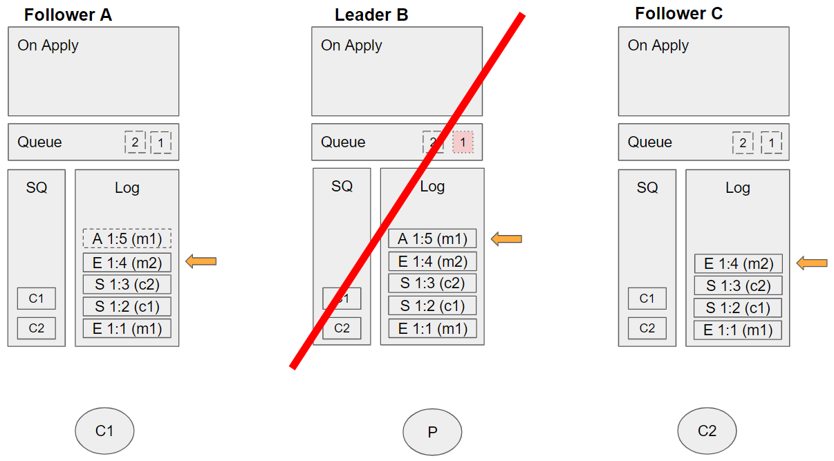 此时,Leader B的SQ不同于追随者(C1在SQ队列尾部),但这只是因为它领先其他两个跟随者一个命令。