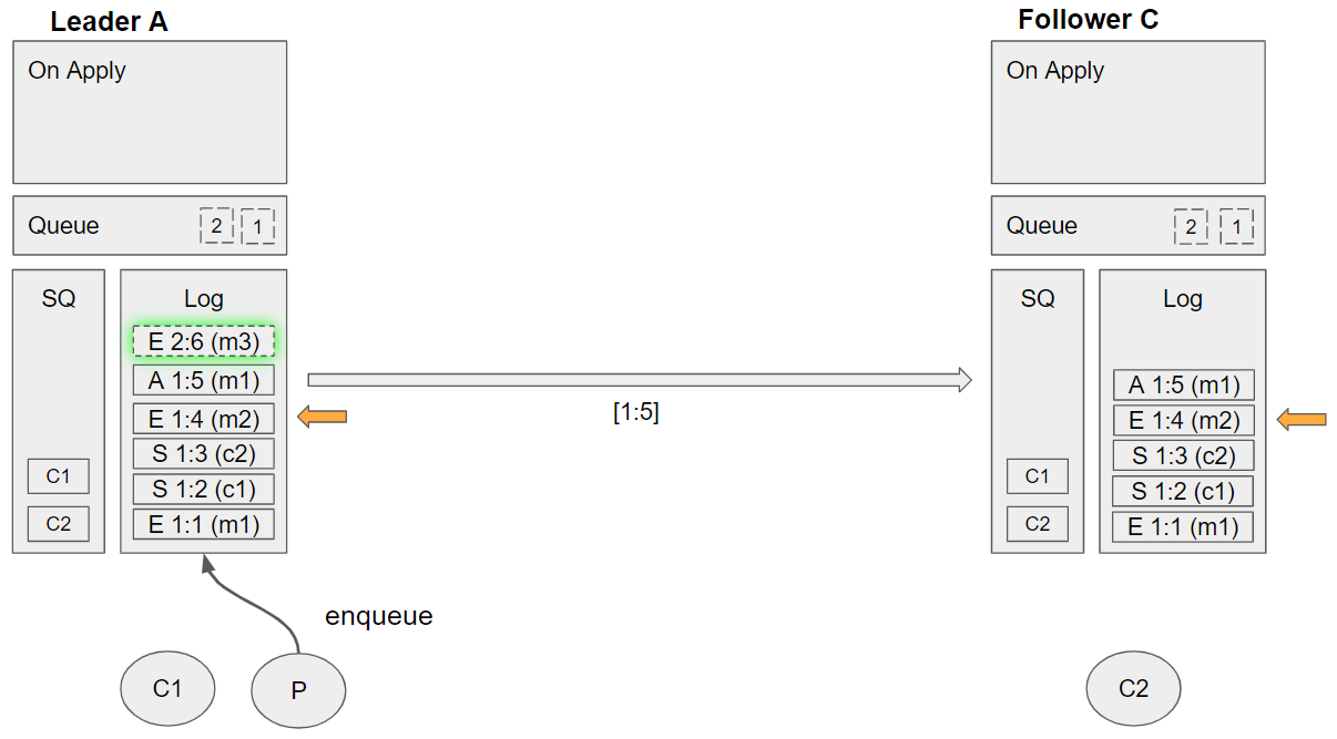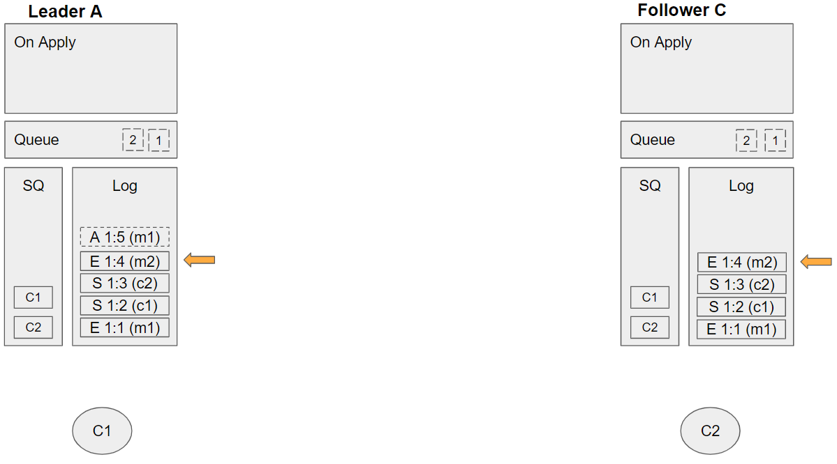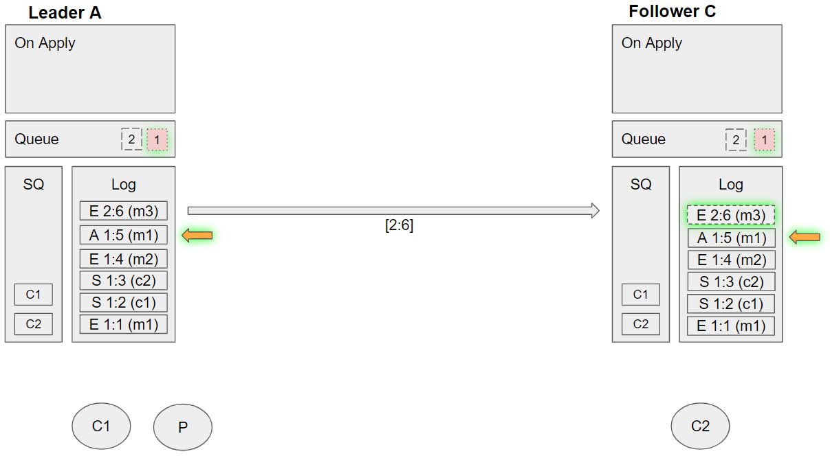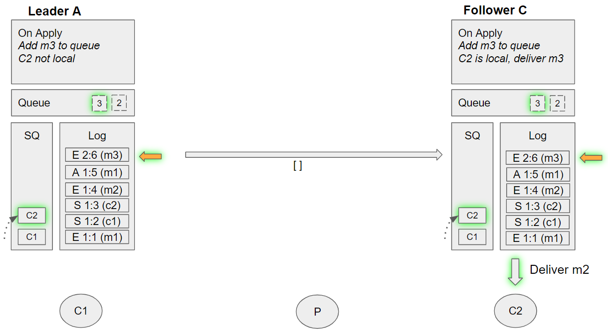 - Follower A处理下一条未送达的消息m2,将C2从SQ中出队,但C2不是本地,C2重新入队SQ,并跟踪m2状态