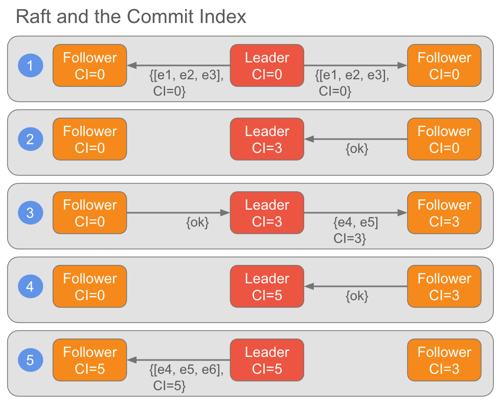 我们的三个协议都有提交索引(commit index)的概念,尽管它们有不同的名称。提交索引是日志中的一个偏移量,此偏移量及之前的所有条目都将在一定数量的节点故障后不丢失。