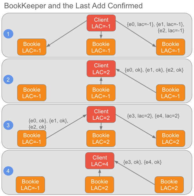 对于BookKeeper,LAC包含在发送到存储节点的每个条目中。存储节点本身对LAC几乎没有什么用处,但它允许客户端后续可以检索这些重要信息。因此,向ledger写入的客户端知道当前的LAC,存储节点可能对LAC的变化稍微滞后,但没关系,协议可以处理这个问题,稍后再详细介绍。