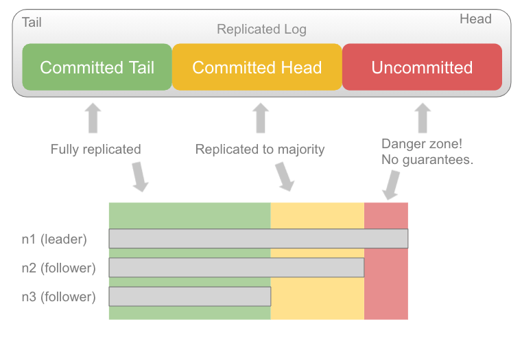 当一切顺利时,我们会期待一个小的未承诺区(红色),一个小的承诺头部(黄色)和一个非常大的承诺尾部(绿色)。但事情并不总是进展顺利,提交的头/尾可以是任意长度,尾部长度可以是0,这意味着没有完全复制的条目。这可能是因为跟随者的速度太慢(以及过去的数据保留),也可能意味着跟随者灾难性地宕机,然后恢复到空状态。