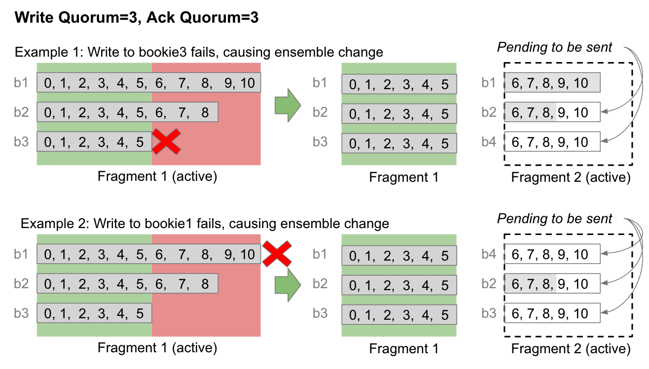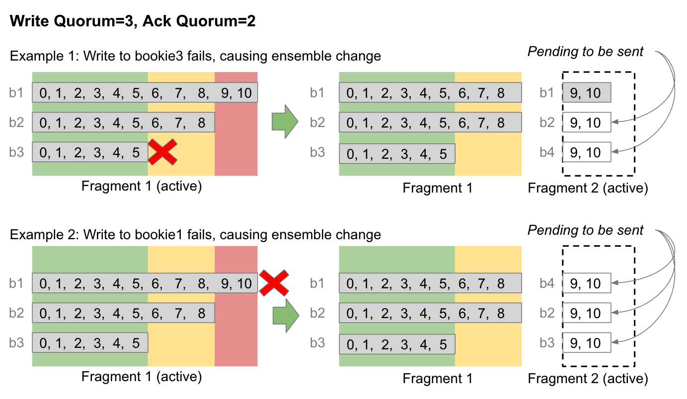 当发生ensemble change时,当前fragment终止于提交头的头部(已达到Ack Quorum的条目)。新fragment从未提交区域的开头开始。