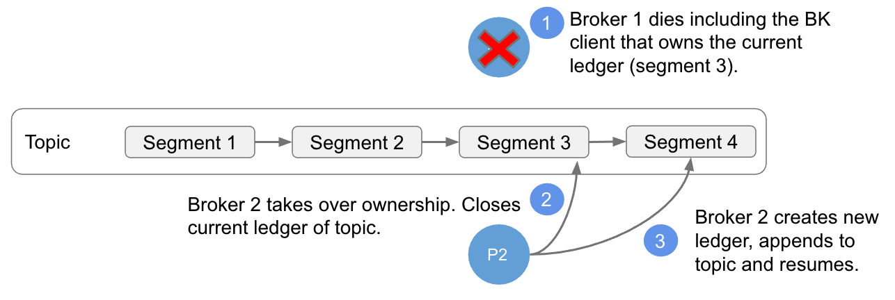 但是如果一个broker挂了,那么他的主题就会被转移到其他broker那里。每个拥有给定主题所有权的broker都会创建一个BookKeeper客户端,以关闭该主题的最后一个分类账(由另一个broker的BookKeeper客户端创建),创建一个新的ledger,并继续为该主题提供写服务。