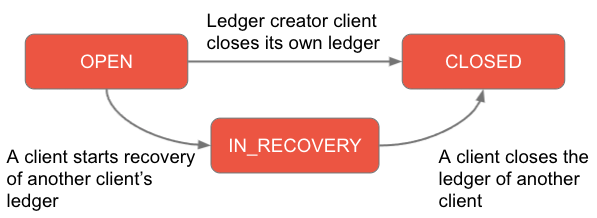 每个ledger都有一个生命周期。任何客户端都可以创建ledger,但只有创建ledger的客户端才能写入。因此正常情况下,客户端A会创建ledger L1,将条目写入其中,一段时间后关闭它。