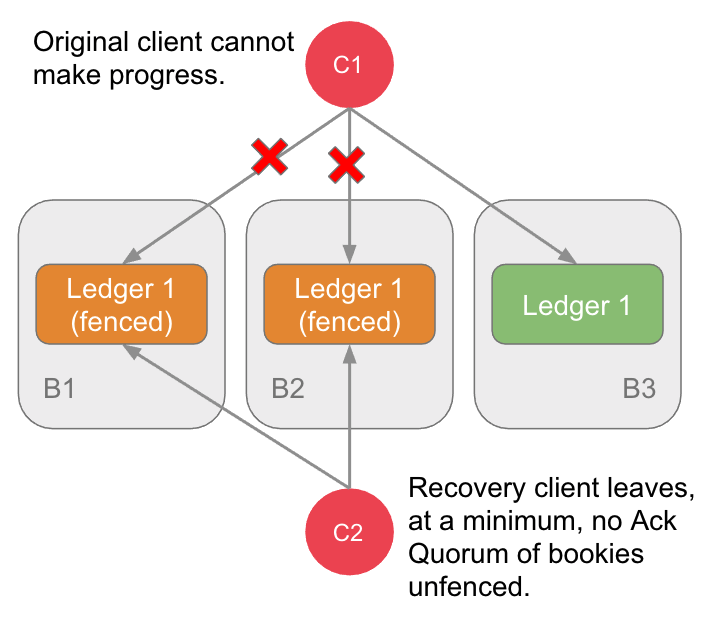 当客户端向每台bookie索要LAC时,它还会在请求上设置fencing标志,使每台bookie对ledger做fence操作。Fencing是一种局部单向幂等操作。一旦一台bookie关闭了一个ledger,该bookie将不再接受任何对该ledger的写入。这将防止原始客户端在其实际上仍然处于活动状态时继续执行写入操作。如果没有fencing,我们可能会出现脑裂的情况,两个客户端认为他们都拥有该topic,并且都在同一ledger上取得执行写入,这可能会导致最终的数据丢失。