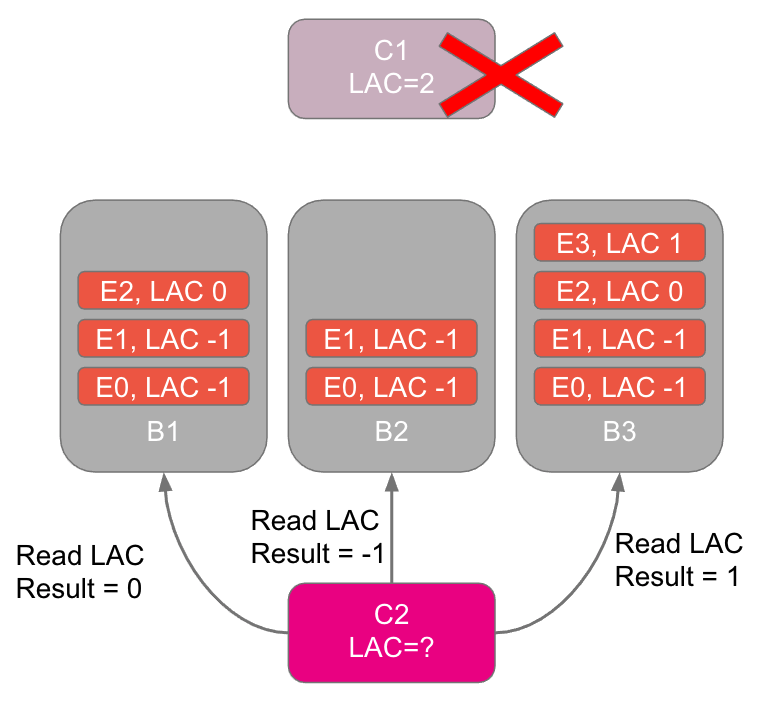 上图中C1写入的E0、E1、E2得到了Ack Quorum个bookie的确认,因此LAC变为2,而E3还没有得到Ack Quorum个bookie的确认,因此E3还未提交。