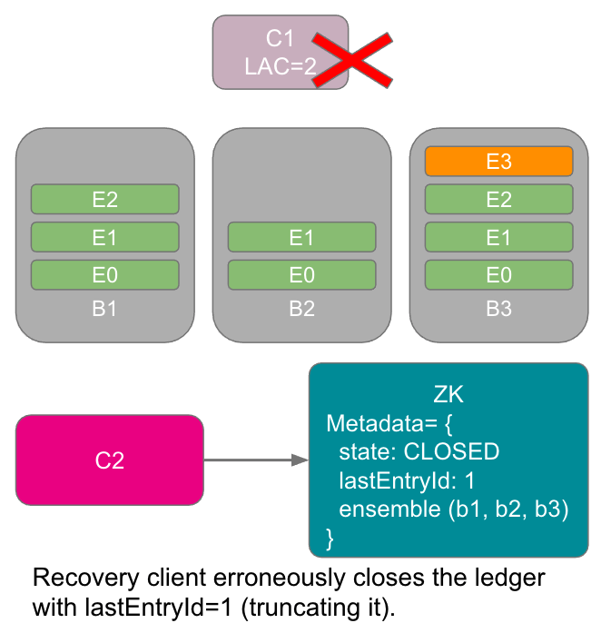 当执行恢复的客户端将Last Entry Id设置得太低,就会发生ledger截断,导致提交的条目无法读取。这些条目至少在AQ个bookie的磁盘上,因此它们是安全的,但由于这些条目现在超过了Last Entry Id,它们无法读取,因此基本上认为是丢失了。