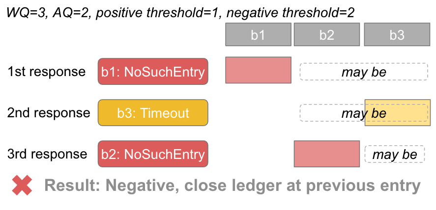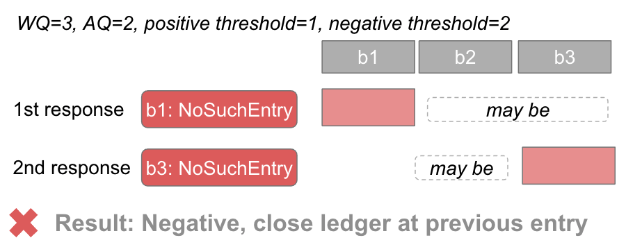 - 客户端在该ledger上启动恢复,当它恢复到条目10时,它收到的前两个响应是来自b1和b2的NoSuchEntry响应。negative阈值已经满足