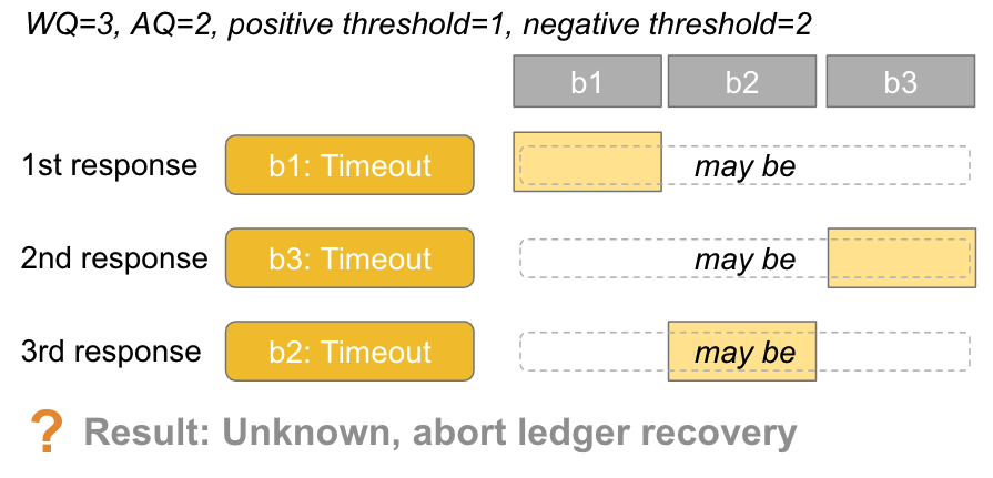 这句话的意思是,根据(WQ-AQ)+1,QA=1,那么需要所有WQ都回复negative响应才能认为条目不可恢复。如果有一台bookie响应超时,ledger recovery过程都将阻塞。