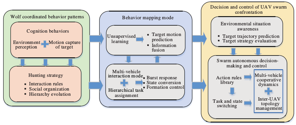 研究狼群智能行为机理,应用于无人机集群系统对抗任务,解决无人机集群协同决策问题。