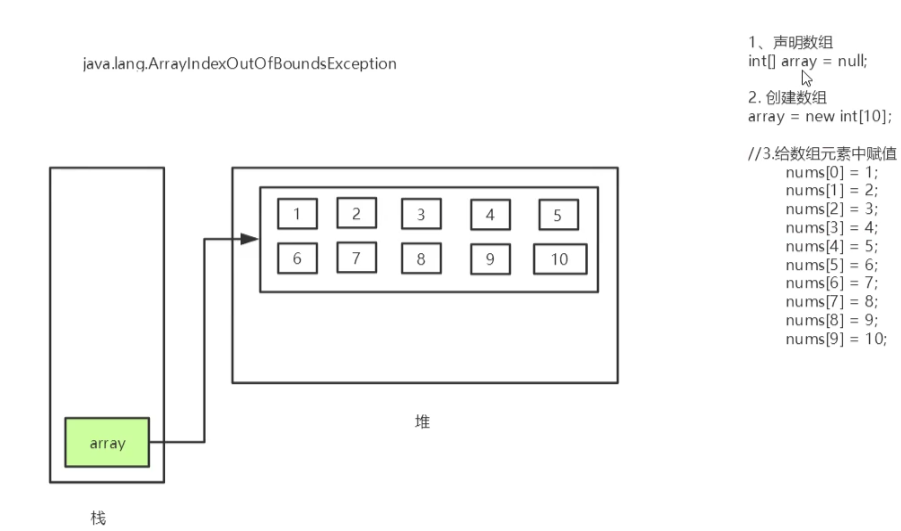 2,在创建数组array = new int [ 10 ]时, 堆 里面开辟了一个均分为十份的空间,对象就是在堆的这片空间里的。