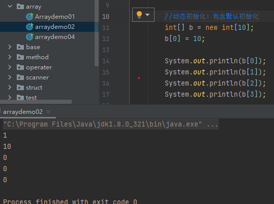 在动态初始化中有一个默认初始化的概念,也就是在创建数组时数组中的元素都有一个默认的值,这个值根据数组类型的不同而不同。在上图中可以看到我们并没有给[1],[2],[3]赋值,但是也输出了三个0。