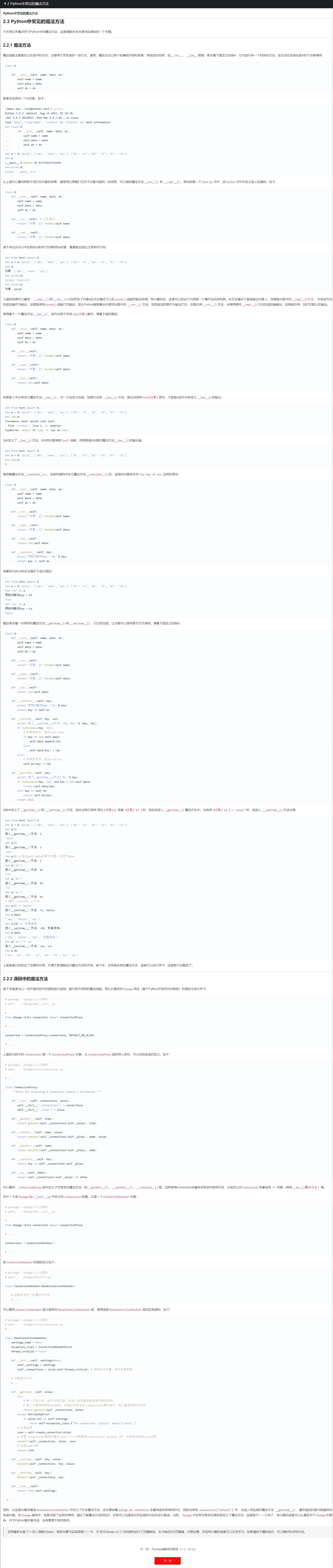 在以前学习的洗后,json能处理的是较为简单的,固定的数据类型,而pickle能处理任意的python的数据类型和对象,包括类 import pickle class Course: def __init__(self,name,price,period): self.name = name self.price = price self.period = period # python = Course('python',20000,'6 months') # linux = Course('linux',15800,'5 months') # import pickle # with open('pickle_file','ab') as f: # pickle.dump(python,f) # pickle.dump(linux,f) import pickle with open('pickle_file','rb') as f: # obj1 = pickle.load(f) # obj2 = pickle.load(f) while True: try: obj = pickle.load(f) print(obj.__dict__) except EOFError: break