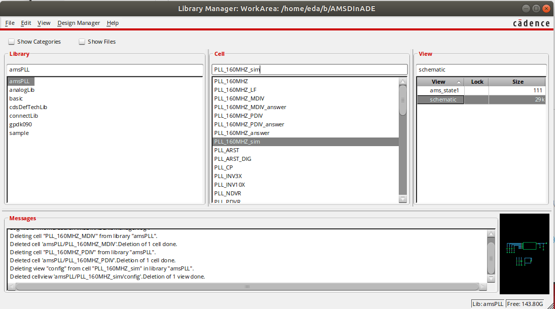 1.在CIW窗口点击 Tools — Library Manager ,可以看到在amsPLL库里生成两个新的cell:PLL_160MHZ_MDIV和PLL_160MHZ_PDIV