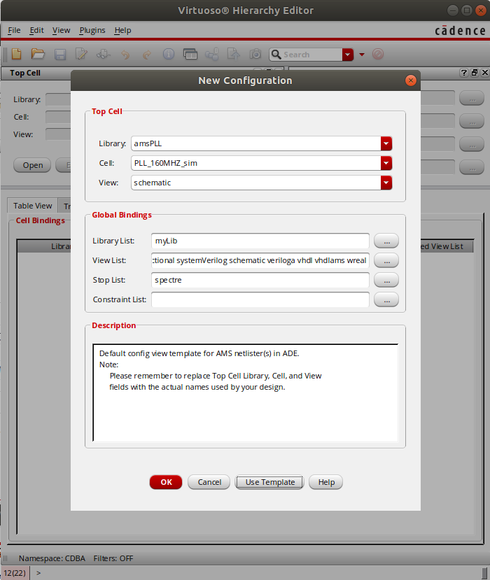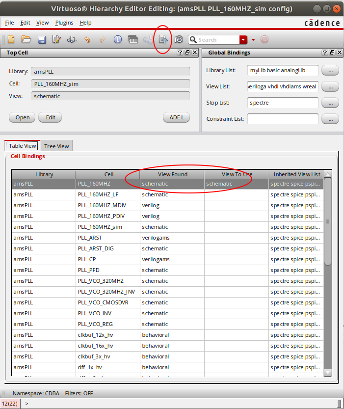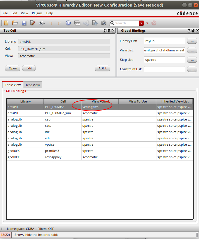 4.点OK后可以看到amsPLL.PLL_160MHZ绑定到“ verilogams”。 这是因为它有提供“ verilogams”视图,并且该视图首先出现在视图列表中。如果打算使用行为模型来模拟此DUT,则可以开始使用了。但是,在此示例中,使用“schematic”config对其进行仿真。需要更改视图。