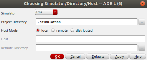 8.在ADE窗口中,单击Setup — Simulator/Directory/Host,然后将模拟器设置为Simulator:ams。单击确定。
