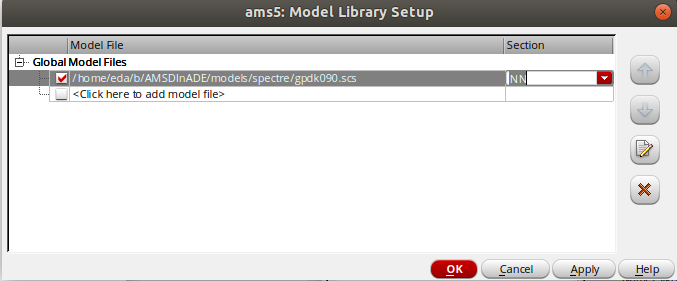 10.单击Setup — Model Libraries。 在“模型库设置”表单中,单击“浏览”按钮以找到从./models/spectre目录中找到gpdk090.scs文件。 单击部分字段,然后选择NN,然后单击“确定”。