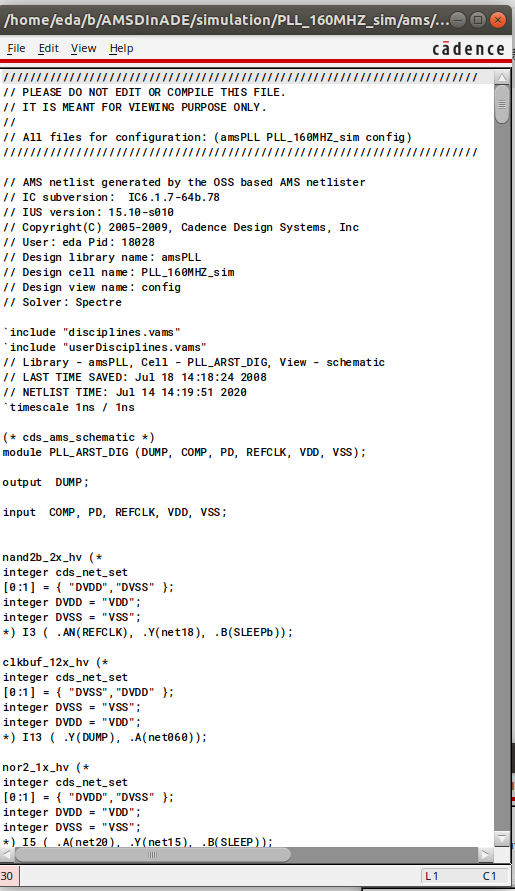 16.在ADE窗口中,单击Simulation-Netlist-Create。 网表处理完成后,单击Simulation - Netlist - Display以显示Verilog-AMS格式的网表。