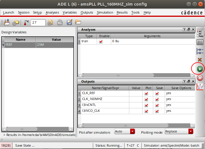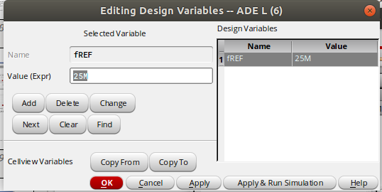 17. 在ADE模拟中窗口,双击列表中的fREF变量,在“值”字段中添加25M然后单击确定