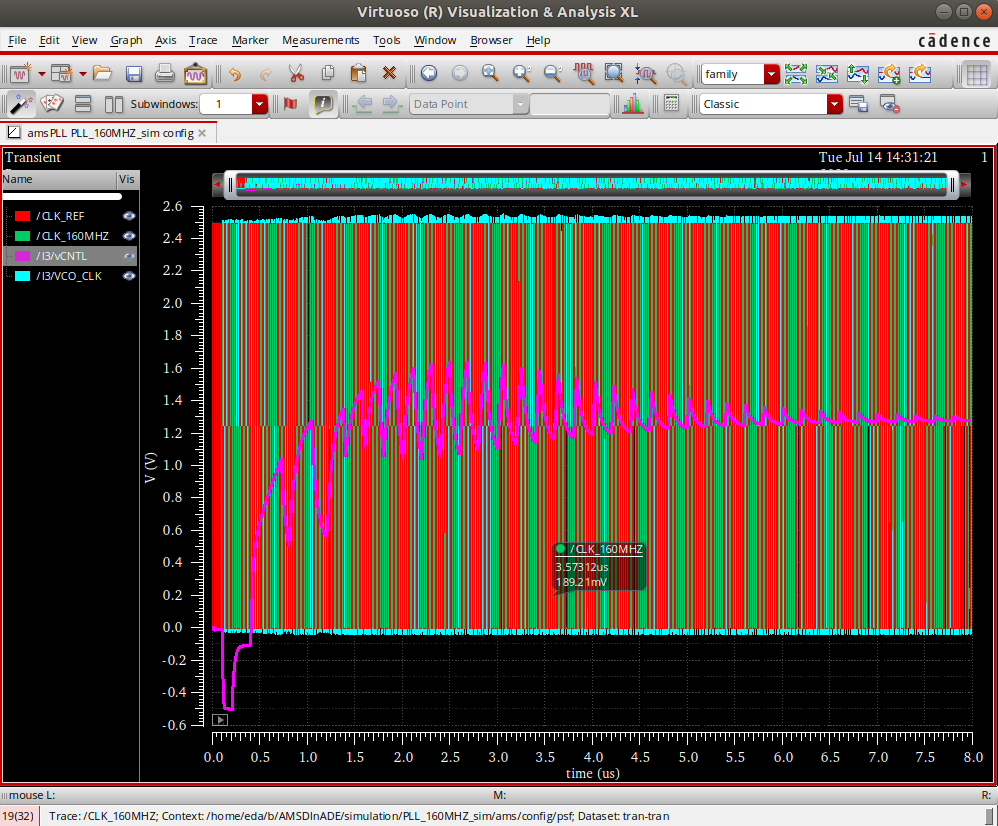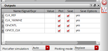 14.在ADE窗口中,单击outputs-To Be Plotted — Select on Schematic选择,然后在顶层点击CLK_REF和CLK_160MHZ。 然后进入I3中点击vCNTL和VCO_CLK两条线。然后在ADE窗口中会显示这四条线。