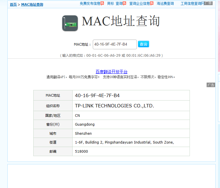 在一个案件中,获取了犯罪嫌疑人的一个MAC地址:40-16-9F-4E-7F-B4,请查询该MAC地址对应的厂商是(附截图)
