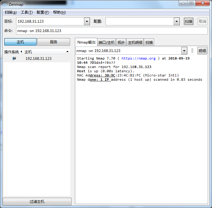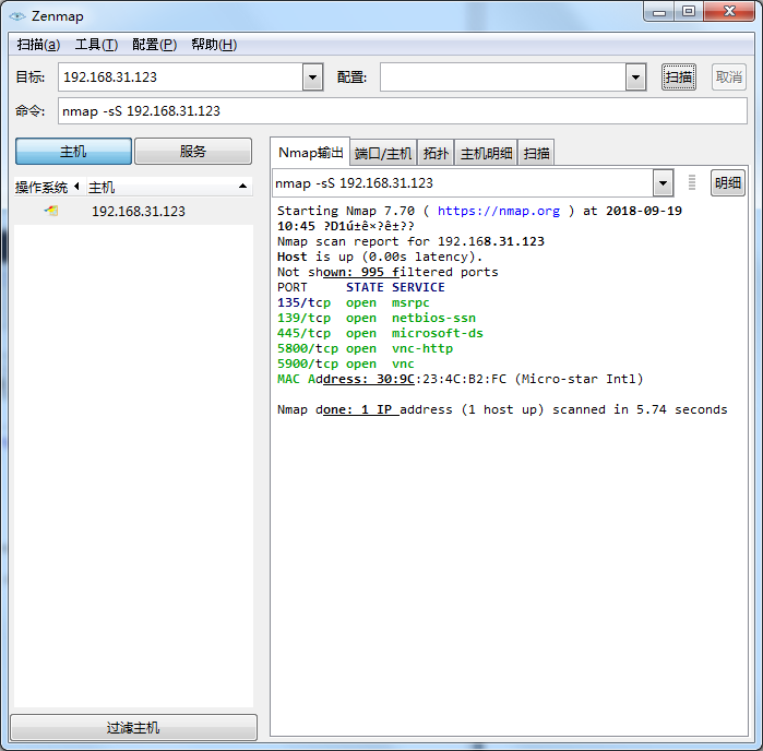 选择一个存活IP地址,扫描所开放的端口(分别用ping扫描,syn扫描尝试),并查询常用端口所对应的服务及操作系统信息。