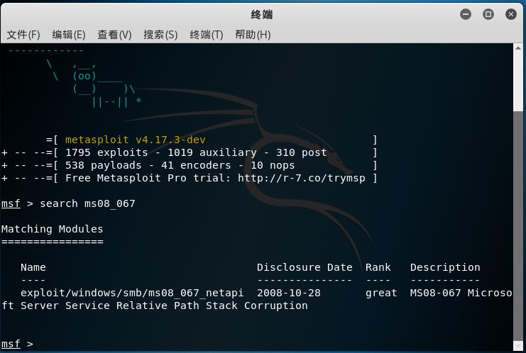 在msfconsole使用search命令搜索MS08067漏洞攻击程序