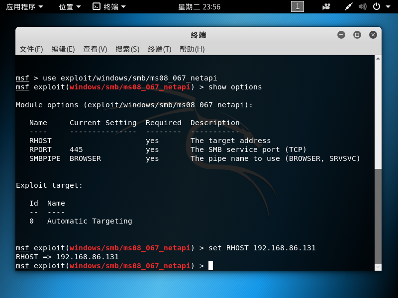 从图中可以看到还需设置RHOST(目标地址)、Exploit target(攻击目标)使用 set 命令设置 Module Options,此处需要设置目标IP即 set RHOST 192.168.86.131