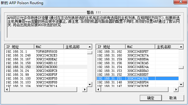 (7)在右侧部分,我们点击192.168.1.1(即网关),点击“OK”。左侧部分表示对哪一个主机进行欺骗,在这里我们选择192.168.31.151(及主机B);右侧部分表示Abel&cain进行伪造的主机,在这里我们选择网关即运行Abel&cain的主机(这里是A)要冒充网关。对B(192.168.31.151)进行ARP欺骗,欺骗的结果是主机B会认为网关是运行Abel&cain软件的主机(即主机A)。在右侧部分选择的主机,就是Abel&cain进行伪造的对象。