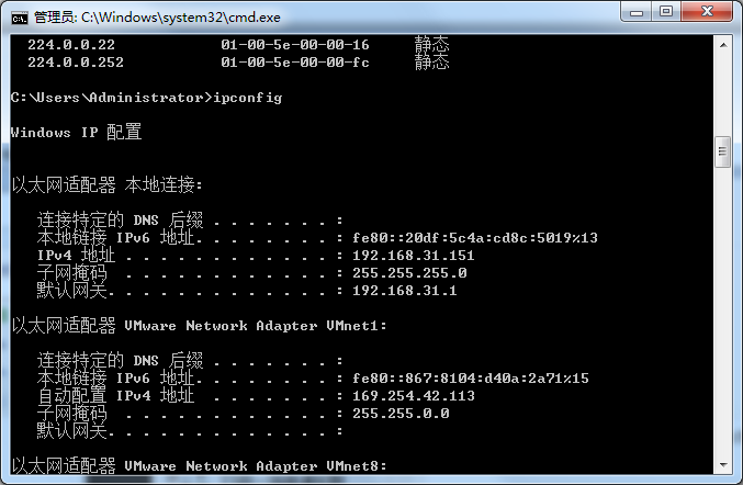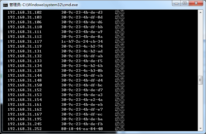 (9) 我们先在主机B上ping一下主机A,然后在cmd窗口输入“arp –a”。此时,在主机B看来,网关的MAC地址就是主机A的MAC地址了。主机B会把A作为网关。如下图所示。