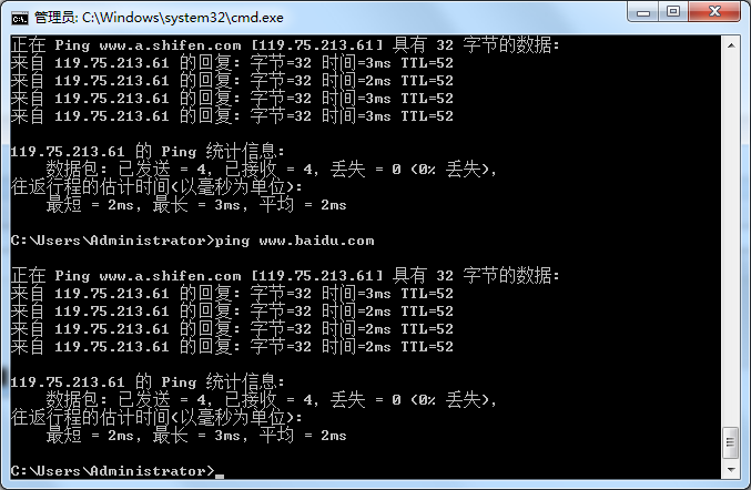 (2)首先在主机B上ping www.baidu.com,此时解析到119.75.213.61。