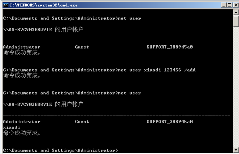 net user xiaodi 123456 /add添加用户名为xiaodi,密码为123456的用户