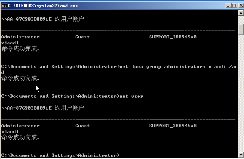 net localgroup administrators xiaodi /add添加用户名为xiaodi的用户到管理员组